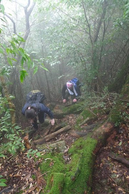 そして、休憩が終わった後は、本日一番の急斜面ッ!「こんな坂、聞いてないよ〜」とyukaちゃんは事前に友達から入手した情報に戸惑い、逆にyamamotoさんは「想像よりも大変ではないけれど、息がきれる〜〜〜」と、ワイワイしながら急斜面を乗り越えましたッ!標高を一気にかせいでいると、雲の中に入って行くかのように、霧の森となってきました。